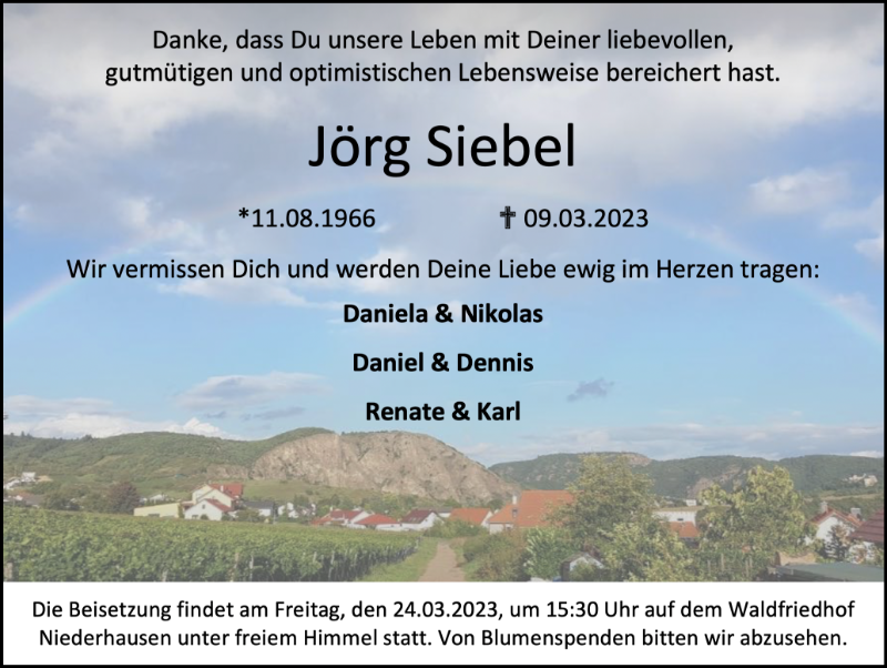 die Beisetzung findet am Freitag, den 24.03.2023, um 15:30 Uhr auf dem Waldfriedhof Niederhausen unter freiem Himmel statt.